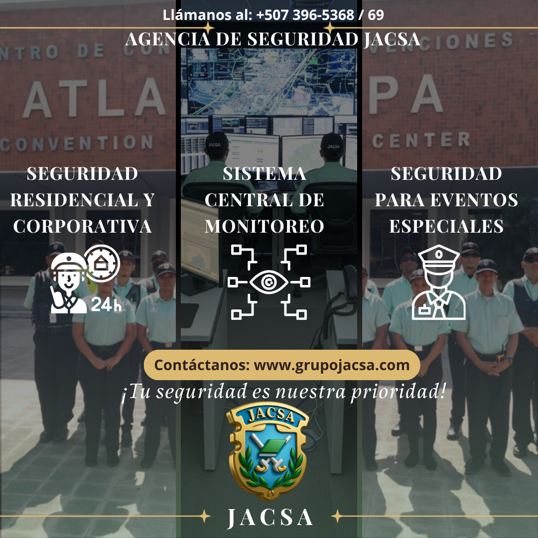 somos una empresa especializada en brindar soluciones integrales de seguridad con personal altamente capacitado, y estamos comprometidos en ofrecerle un servicio confiable, eficiente y adaptado a sus necesidades específicas. Entre nuestras principales ofertas se incluyen: - Vigilancia presencial y monitoreo 24/7. - Control de acceso. - Seguridad para eventos y proyectos en construcción. - Protección personal. - Asesorías y evaluaciones de riesgos sin costo. 📧 jacsa2563@gmail.com 📧 jacsamercadeo@gmail.com Tel. 📞 (507) 396-5369 / 68 📱 (507) 6694-6988 GRUPO JACSA 🌐 www.grupojacsa.comButton